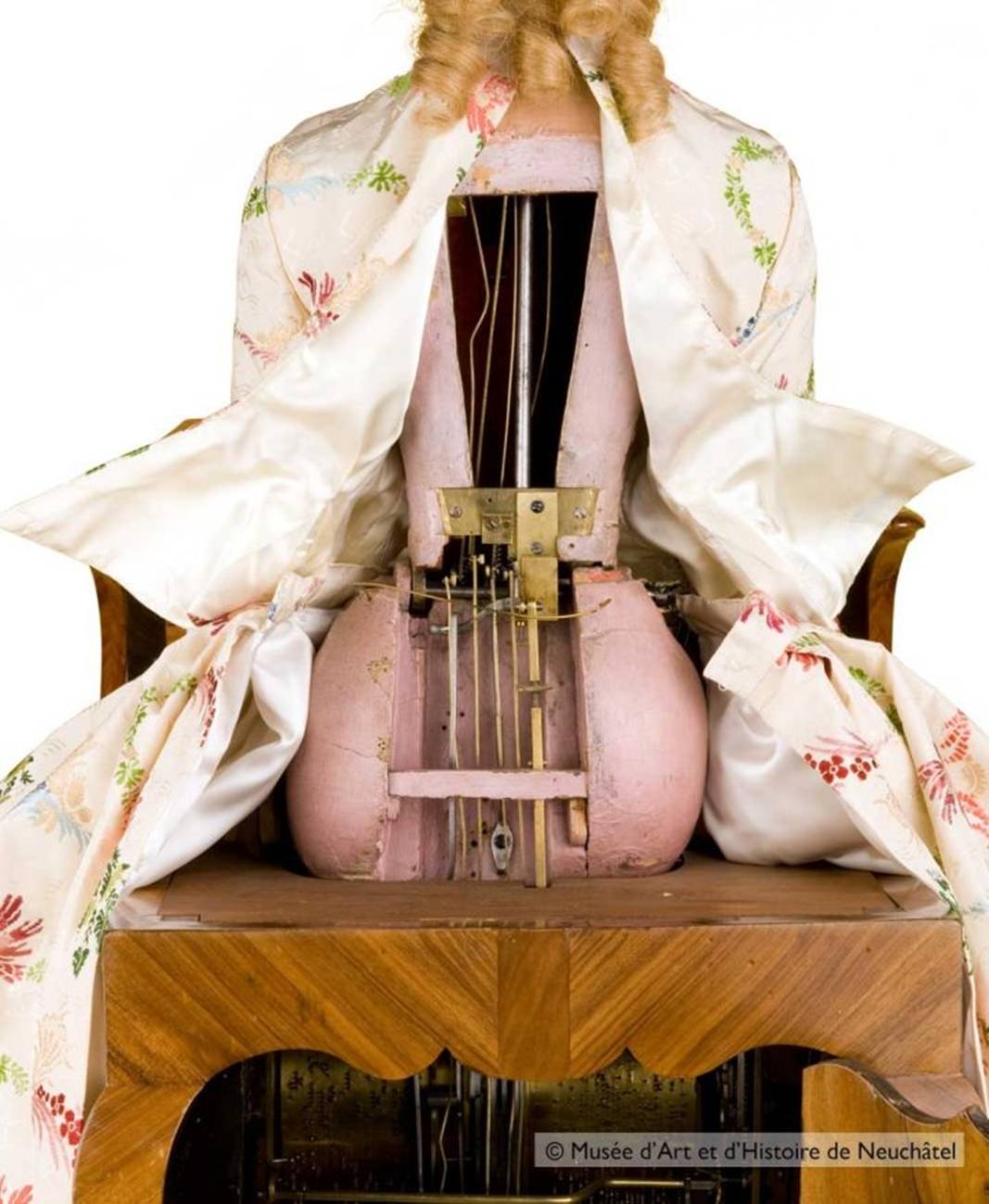 “音乐家”是位身着洛可可式长裙的少女,它可以演奏五首曲子。当手指在键盘上轻重疾徐时,它的身体也随之优雅地摆动,仔细观察甚至可见它胸前一起一伏的呼吸。一曲弹罢,它还会向听众颔首致意。“音乐家”由2500多个部件组成,两个金属圆筒上的突起记录着手臂和十指的动作,所以它是真正在“弹奏”一个48根音管的风琴。